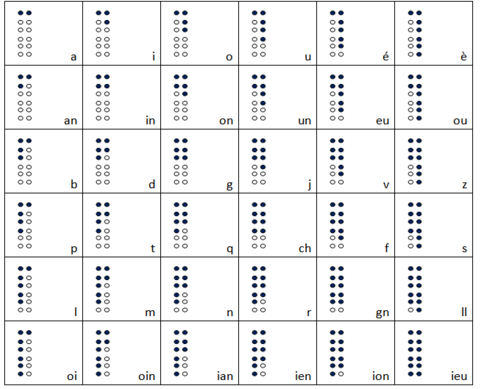 A escrita noturna utilizava pontos em relevo que eram lidos pelo tato. Ela tinha como princípio a transcrição de pequenas unidades de som, os chamados fonemas, em um padrão de pontos em relevo. Na imagem, vemos o Sistema Barbier na língua francesa. Crédito: Cristinacubellsperez/ Wikipedia Commons