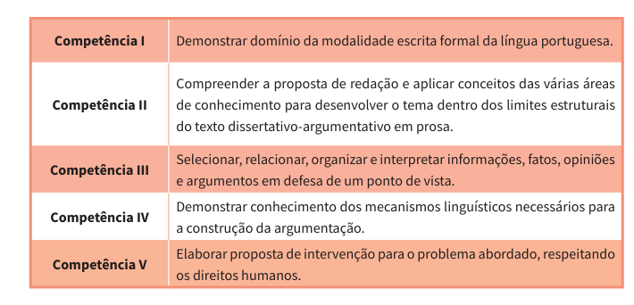 A redação será corrigida com base em cinco competências, cada uma valendo até 200 pontos: