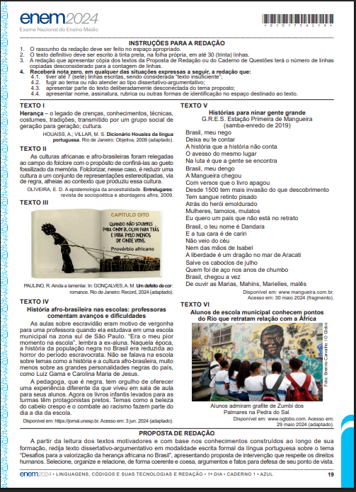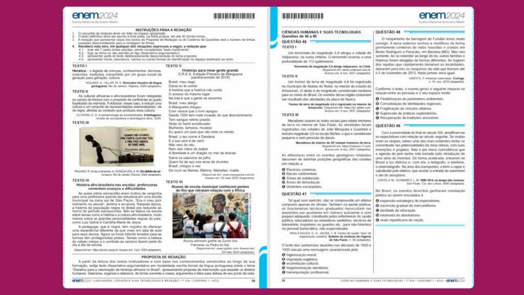Quando as perguntas de Linguagens terminam e surge uma página com textos, gráficos, citações ou imagens, você chegou à proposta de redação.