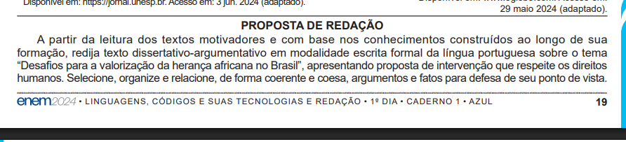 A proposta de redação, também chamada de enunciado, vem logo após os textos motivadores e é o momento em que o tema é revelado.