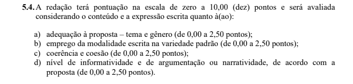 A banca avalia sua redação com base em 4 critérios, cada um valendo até 2,5 pontos.