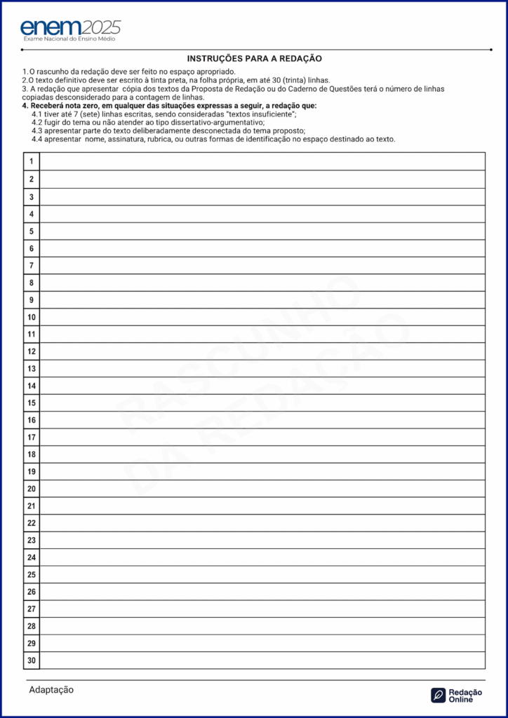 As orientações oficiais — como as regras sobre nota zero, número mínimo de linhas e proibições — não estão mais na proposta de redação, e sim na folha de rascunho.