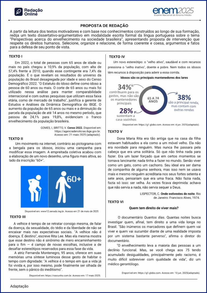 O tema “Perspectivas acerca do envelhecimento na sociedade brasileira” foi publicado meses antes da prova no Redação Online, com o mesmo texto motivador do IBGE.