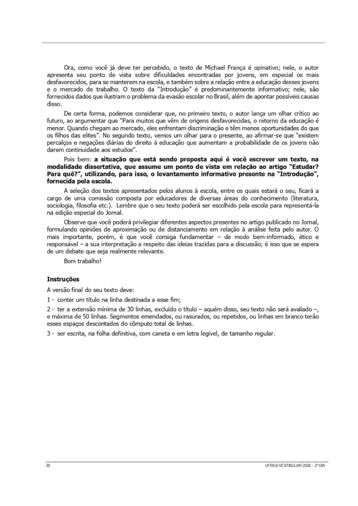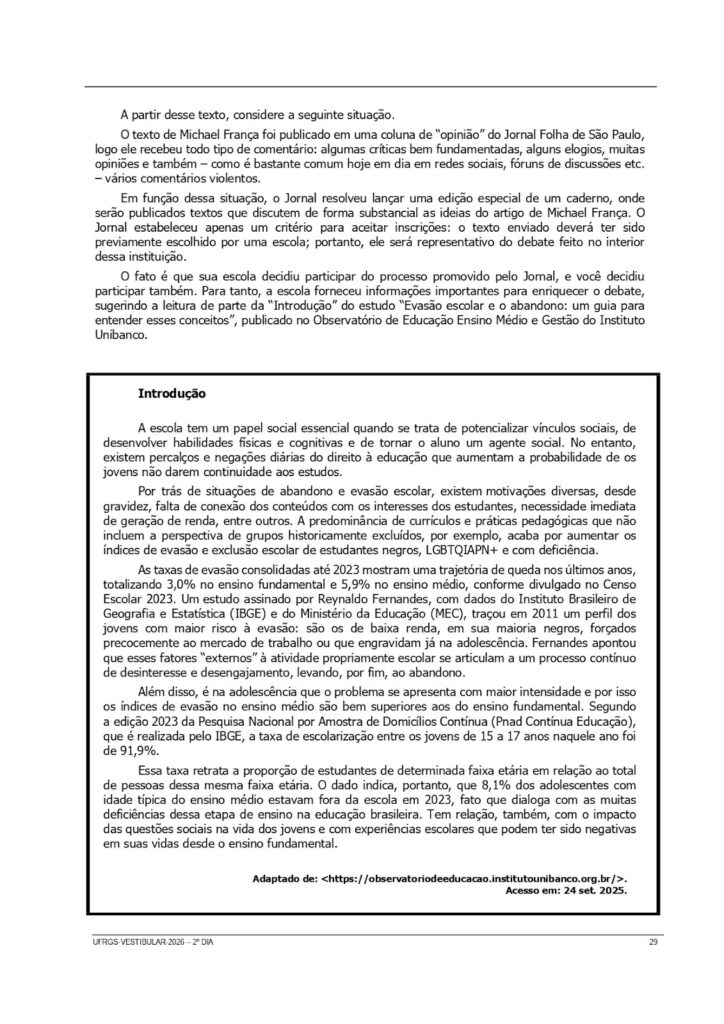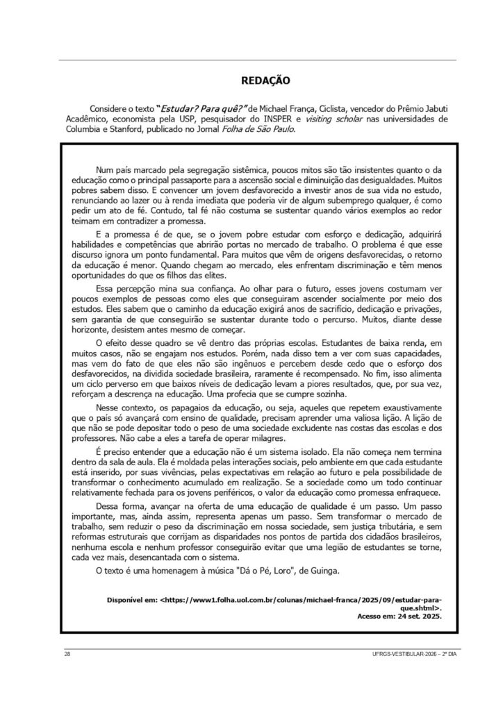 O ponto de partida da proposta foi o artigo “Estudar? Para quê?”, publicado na Folha de S. Paulo por Michael França. Em seguida, a banca adicionou um texto informativo do Instituto Unibanco, oferecendo dados atualizados sobre abandono e evasão, criando uma coletânea que exige interpretação crítica, sensibilidade social e domínio textual.