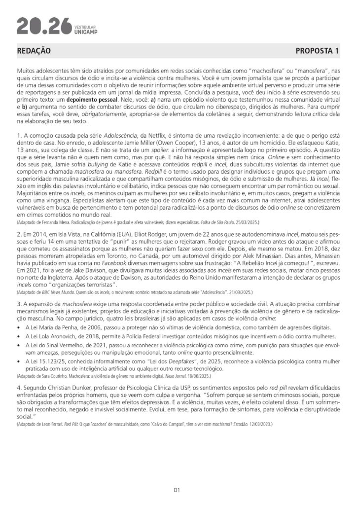 Unicamp 2026: temas de redação abordam ‘machosfera’ e a importância histórica da CLT | Análise completa