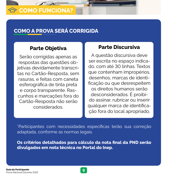 Aplicada junto ao Enade das Licenciaturas, ela usa os mesmos instrumentos de avaliação e pode servir como etapa única ou complementar em processos seletivos de redes estaduais e municipais.